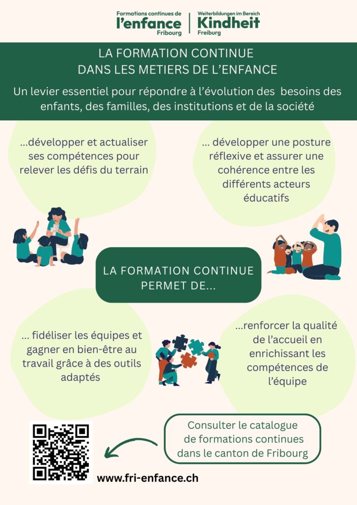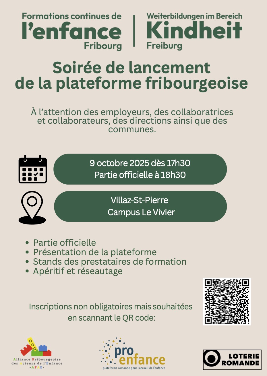Liens et documents Présentation Powerpoint Soirée de lancement 9 octobre 2025 Articles de presse Rapport de l’enquête 2024 Formations reconnues par le Service de l’enfance et de la jeunesse (SEJ) pour travailler dans les structures d’accueil à la journée du canton de Fribourg Formation reconnues SEJ ↗